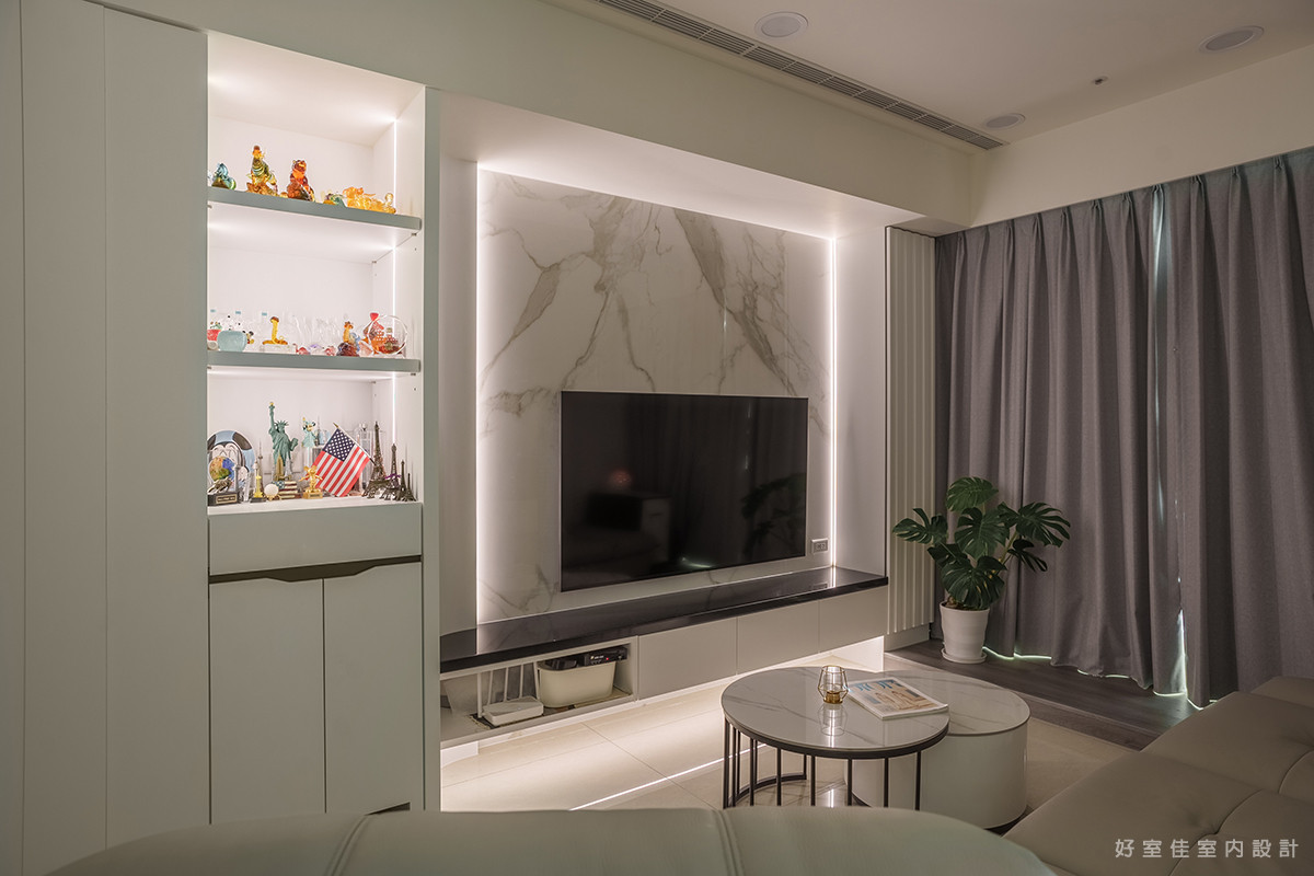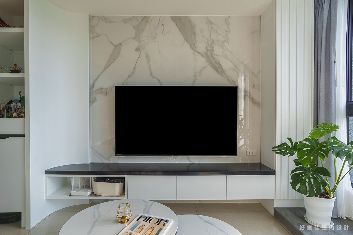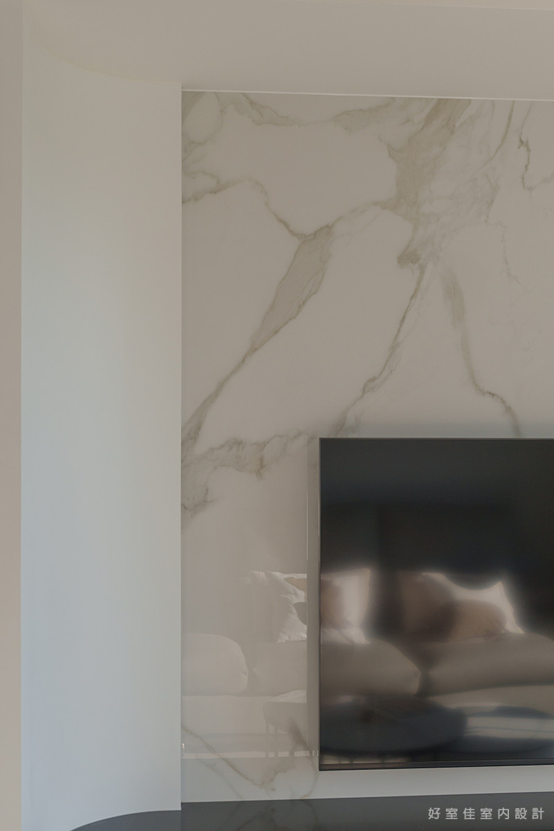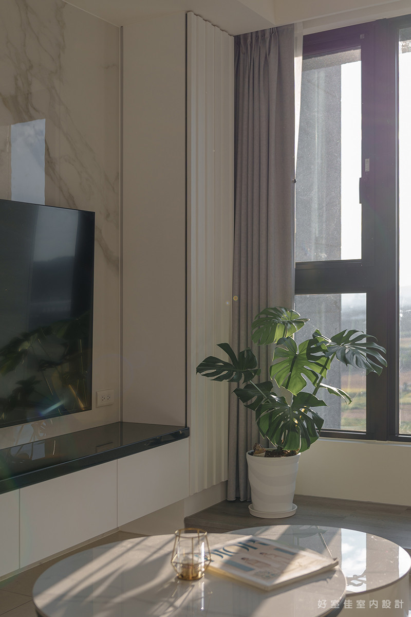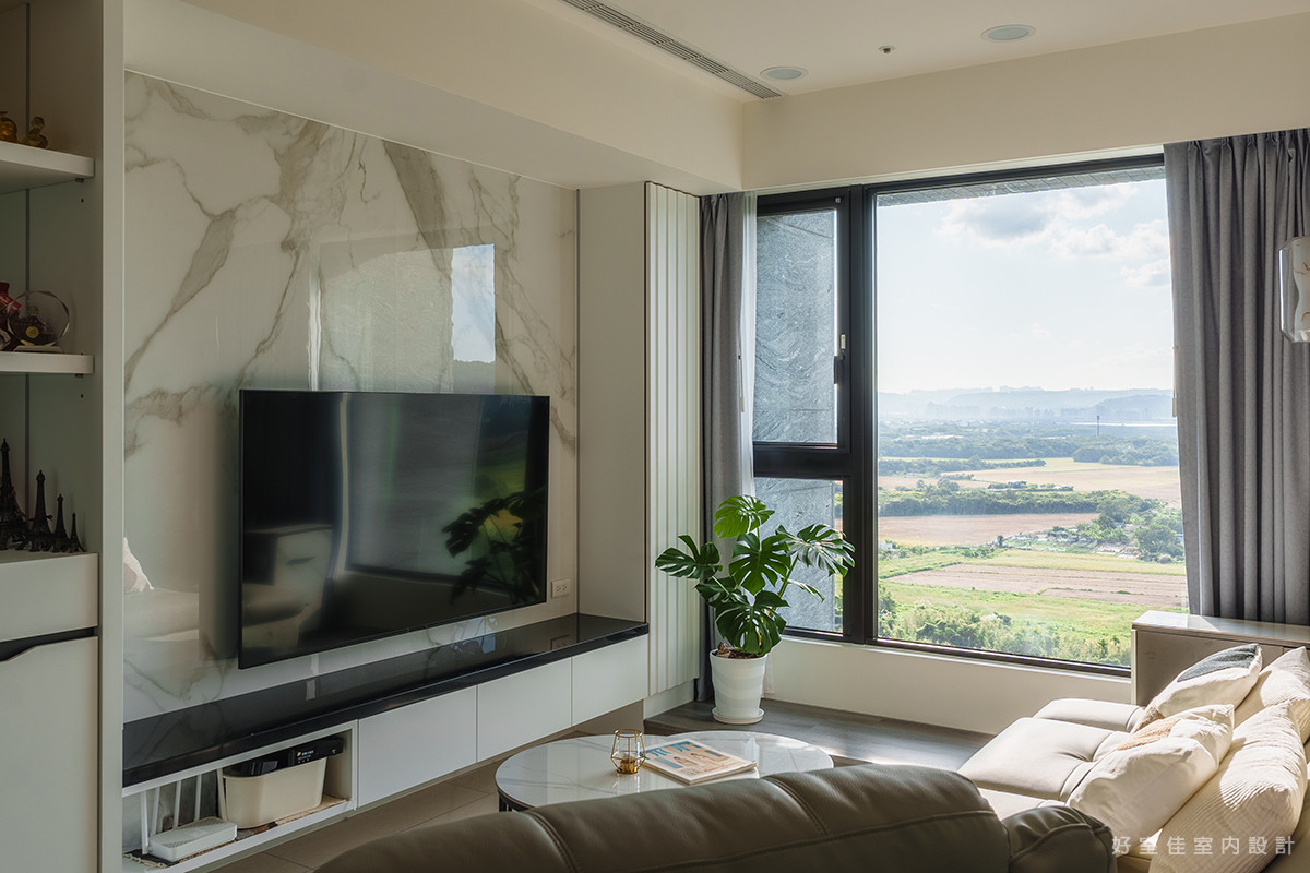 客廳區域以大理石紋理的電視牆作為視覺焦點,自然的石材紋路呼應著窗外的雲淡風輕,營造出大氣而不失優雅的質感。窗邊的一株龜背芋,為潔白的空間點綴了一抹清新的生機。