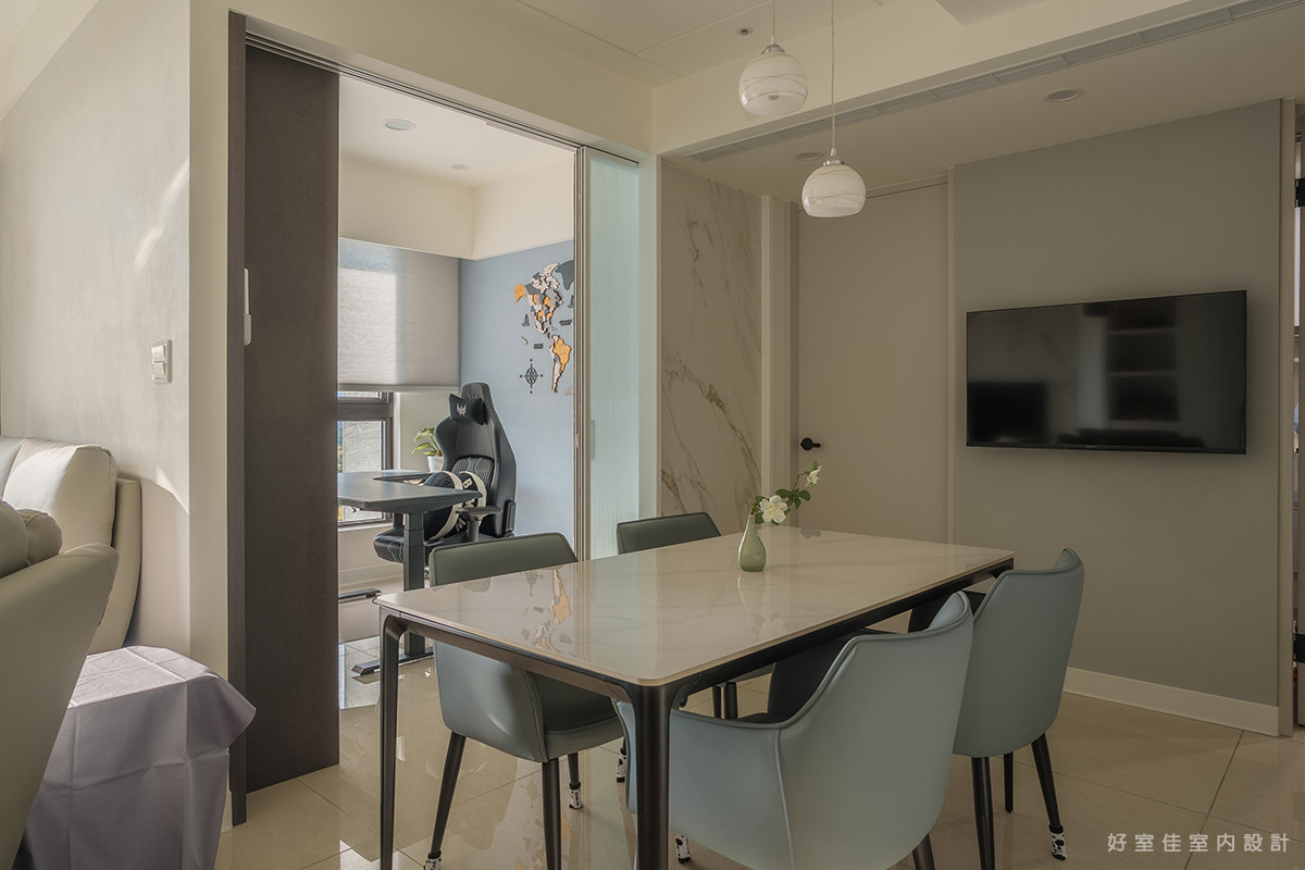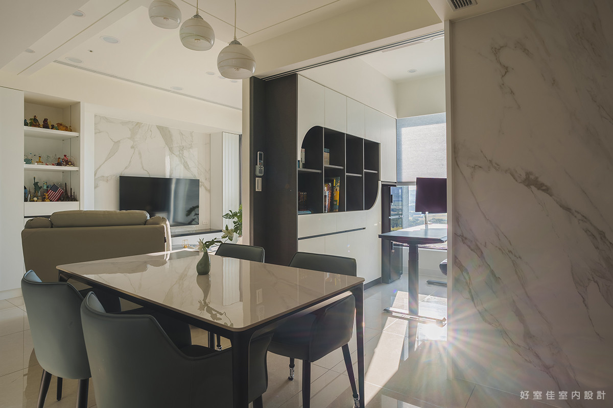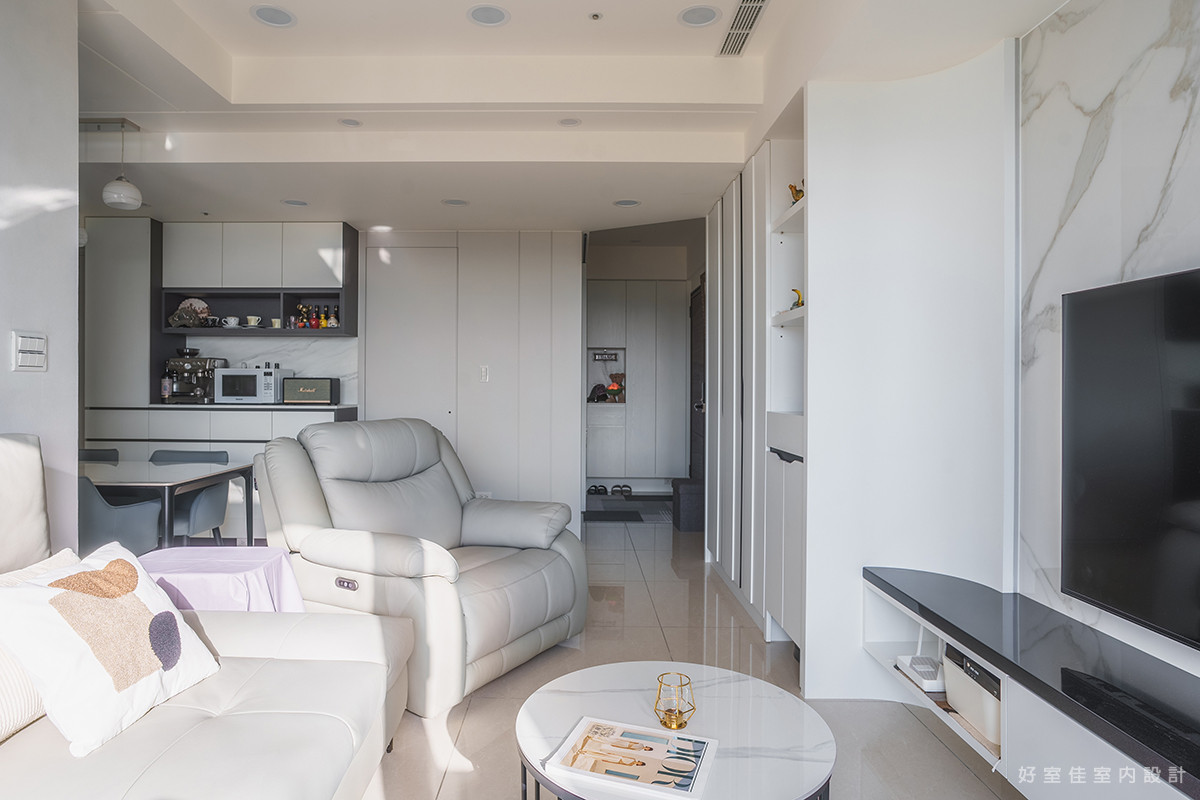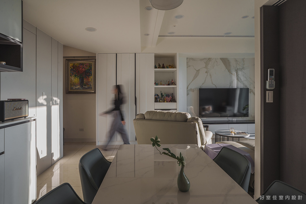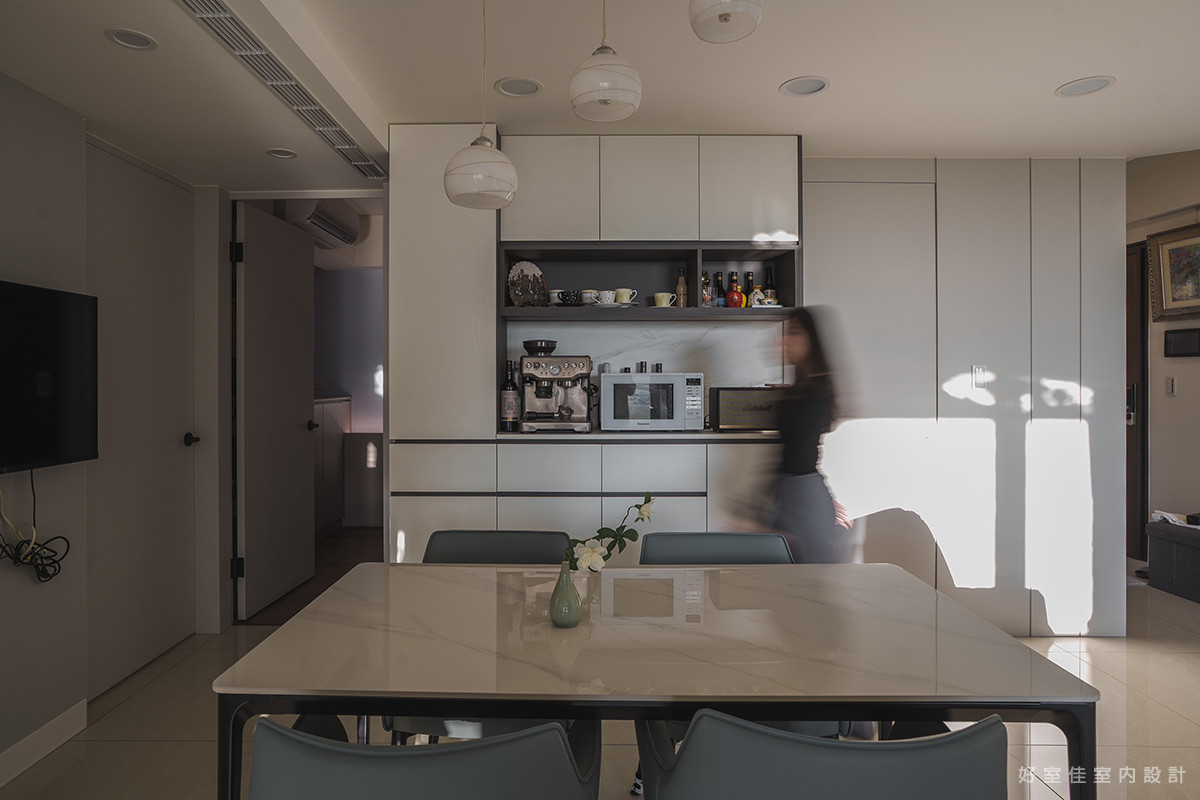 視角轉向室內,開放式的格局讓客廳與餐廳的動線一氣呵成,放大了空間的通透感。淺灰色的皮革沙發與圓形石紋茶几,堆疊出層次豐富的現代簡約風格。後方的餐邊櫃設計,不僅滿足了收納需求,更闢出一方專屬的咖啡角落,讓居家時光在咖啡香氣與窗景的陪伴下,顯得格外愜意與溫暖。