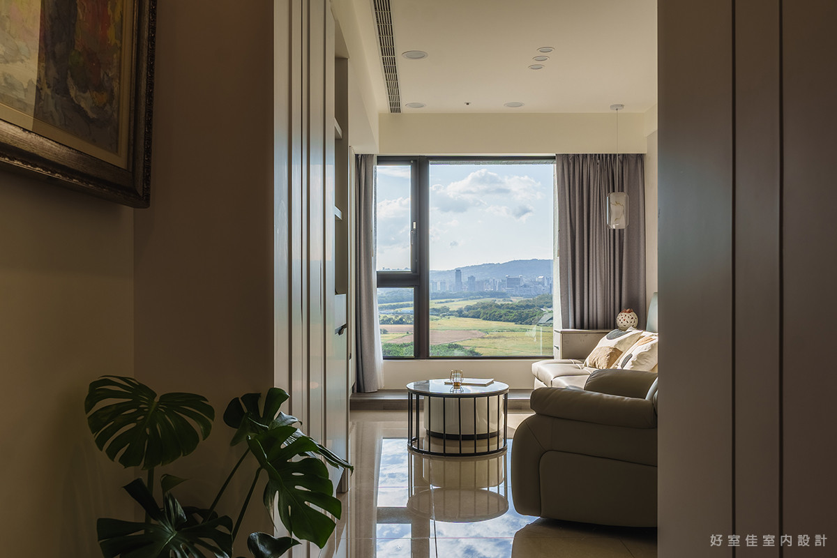午後的陽光透過大面落地窗恣意灑落,將戶外的遼闊綠意與室內的純淨色調完美融合。